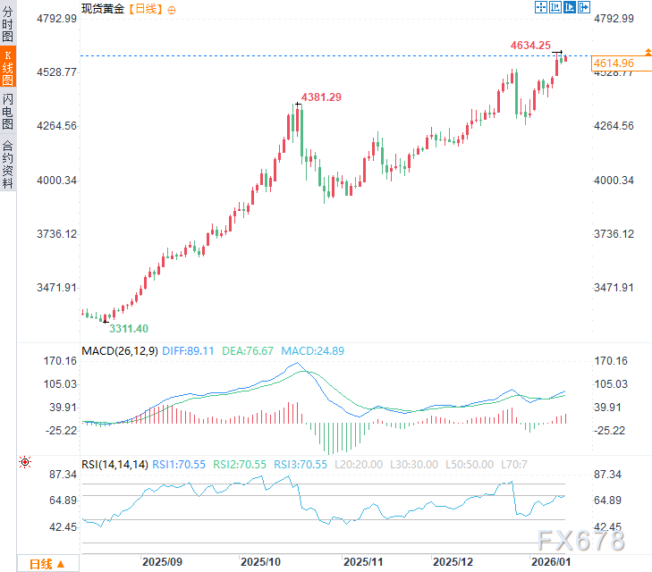 格陵兰事件并非普通外交摩擦,其背后是大国战略博弈与联盟信任危机,已成功向市场注入“地缘政治风险溢价”。黄金作为终极避风港,价格将直接受益于该事件的任何升级,并为投资者对冲国际秩序不确定性提供了经典工具。周三亚市时段,现货黄金震荡上行,日内涨幅约0.65%,现交投于4615美元附近,接近历史高点,隔夜金价一度刷新历史高点至每盎司4634.25美元,。