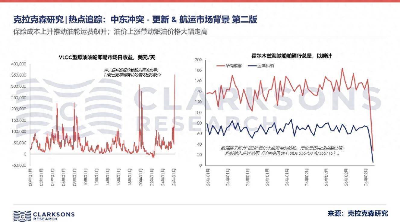 智通财经APP获悉,3月3日,克拉克森研究发布专题报告指出,霍尔木兹海峡船舶通行量显著下滑:3月1日霍尔木兹海峡船舶通行量较“正常”水平下降80%。在全球航运市场方面,由于当前局势仍存在重大不确定性,周一中东地区实际成交的租约十分有限,市场参与者普遍处于观望状态,难以评估当前市场的实际运费水平。不过,初步预计油轮运费水平将进一步大幅上涨,尤其是VLCC型原油油轮。短期来看,受保险成本上升(部分保险公司已宣布即将取消特定水域的战争风险保费)、风险溢价增加及通行中断影响,运费将进一步上涨。