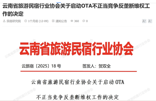 2025年11月21日,云南省旅游民宿行业协会发布《关于启动OTA不正当竞争反垄断维权工作的决定》。该文件称,近年来,协会接到多个会员单位投诉,反映携程等个别OTA平台利用其市场支配地位万生优配,对云南民宿行业实施了包括但不限于“二选一”霸王条款、单方面随意涨佣、设置不公平交易条件、屏蔽流量等不正当竞争行为。据协会会长贺双全透露,协会已和法务对接确认了相关事实并掌握部分关键证据,正推进集体维权工作。据了解,该协会由云南省文化和旅游厅与云南省商务厅共同指导成立,目前拥有近7000家酒店民宿会员。