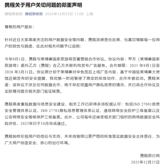 面对舆论压力,携程于2025年12月25日发布声明,称“协议未曾启动,且不涉及任何数据合作”,并强调公司已通过ISO 27001、ISO 27701等多项国际信息安全认证,且2025年10月已完成国家网络数据安全风险评估。然而,这份声明并未完全打消公众的疑虑。